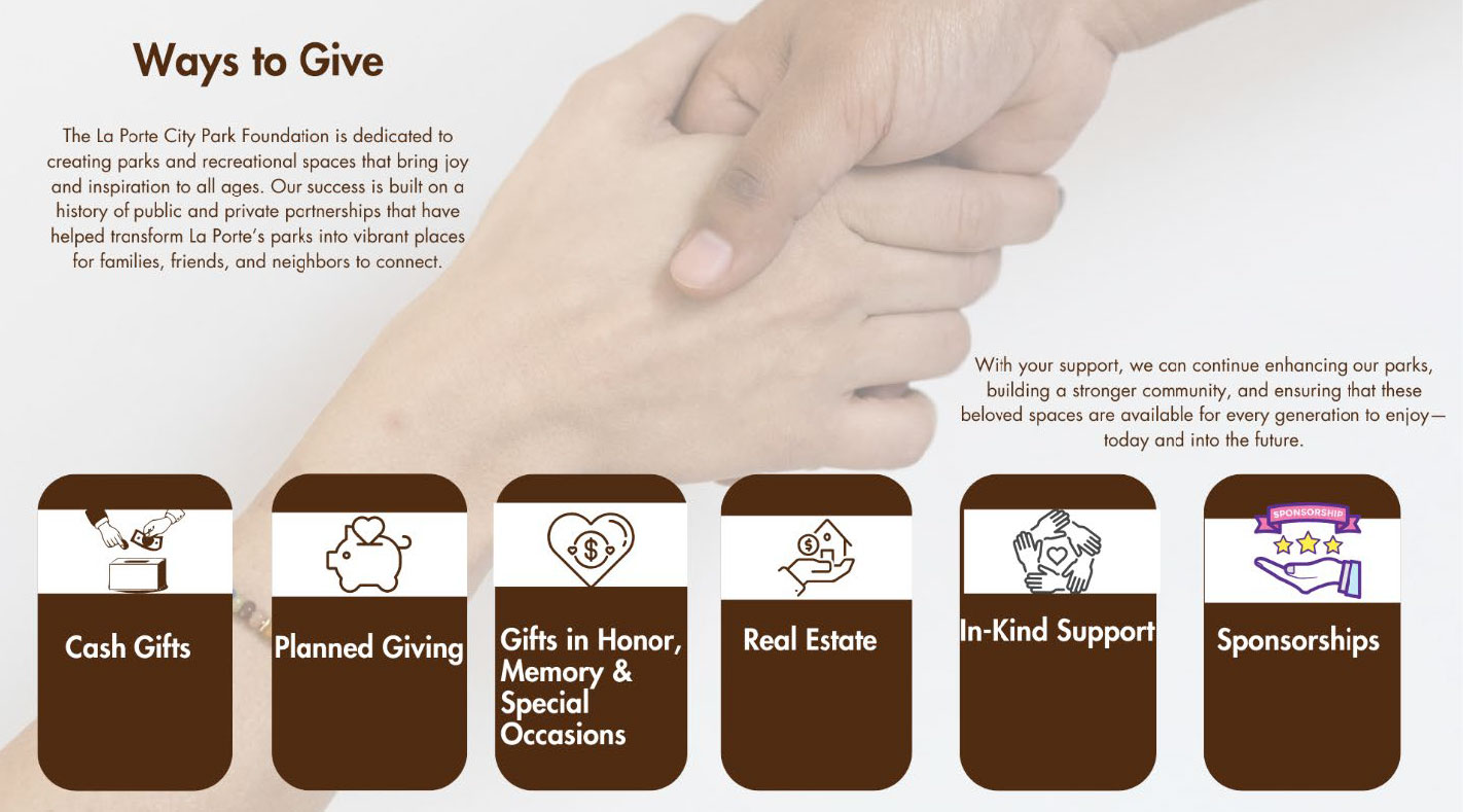 One of the best ways to support the La Porte City Park Foundation is to share your time, talent and money. Please donate today!